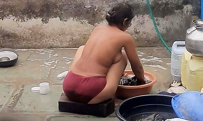 Indian Desi Bhabhi Outside Bathing dressed in see through nighty and flashing neighbor