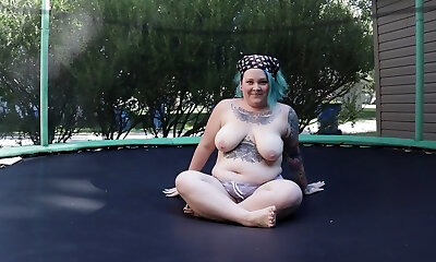 Fat Tattooed Cougar Jumping and Stripping on a Trampoline