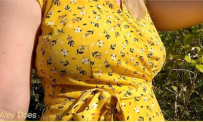 Wifey heads out in a cute summer dress bare-breasted and looks amazing with her blond hair.