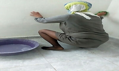 Hijab girl cleaning kitchen