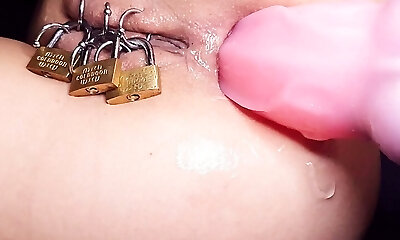 Fisting of Assfuck when Caged Pierced Pussy Closed by Padlock