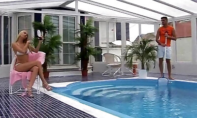Incredible blonde cougar seduced her pool cleaner and gets fucked well by the pool